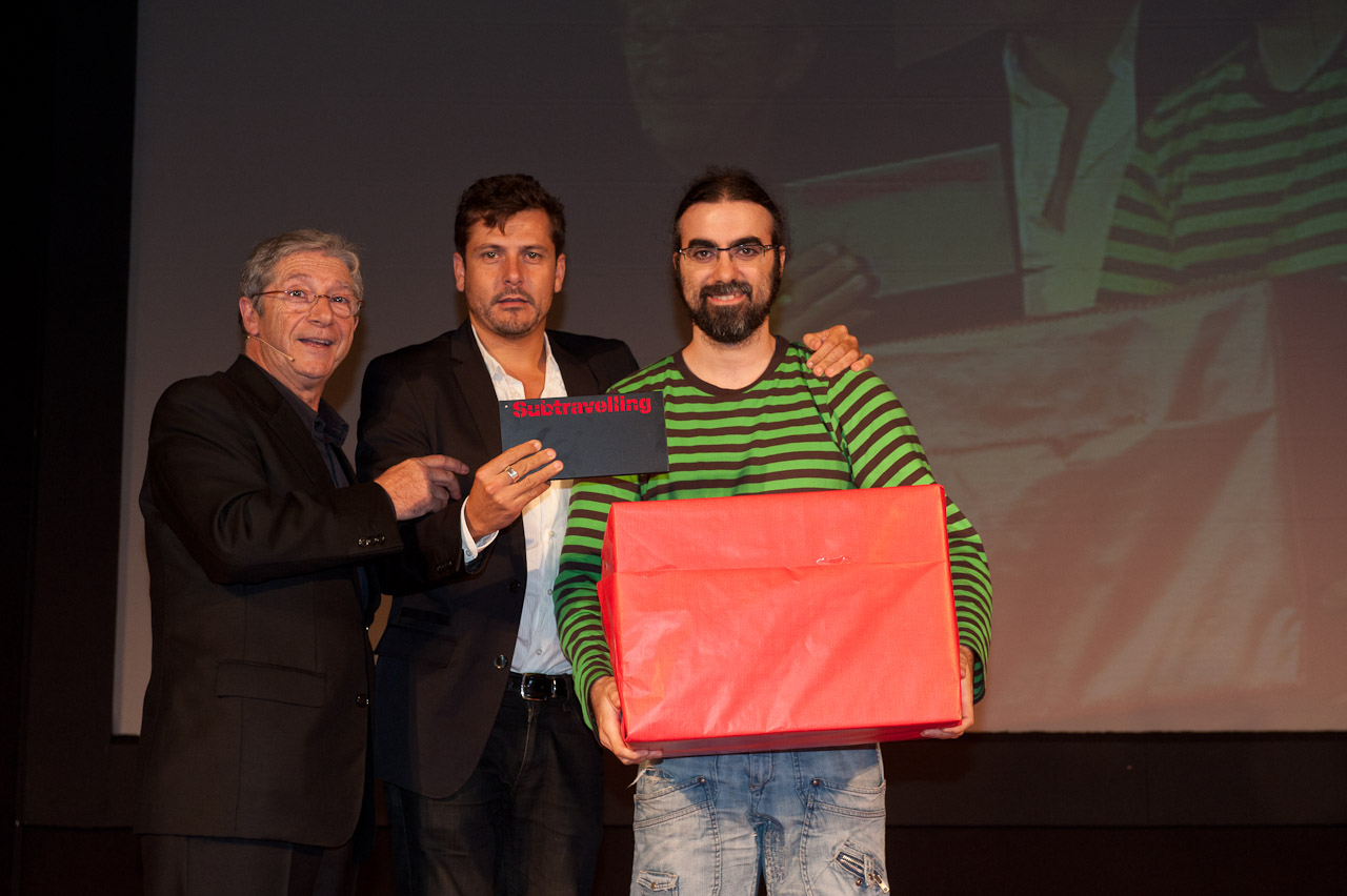 The award ceremony of the 3rd Subtravelling Short-Film Festival was held last night. I attended it on behalf of the team of LA HUIDA to collect the Best Short Award in the Campus section. I received the award from actor Joan Pera (who was hosting the show) and film director Kike Maíllo. I sincerely hope I didn't infected them, as I attended the ceremony being feverish because of the flu.